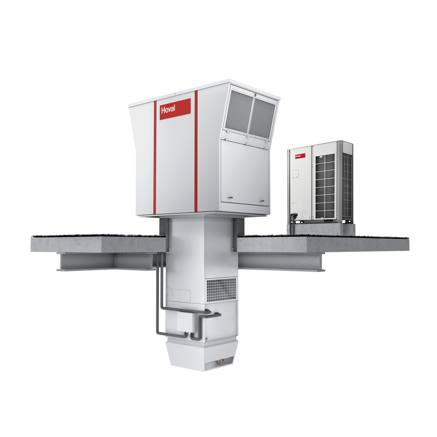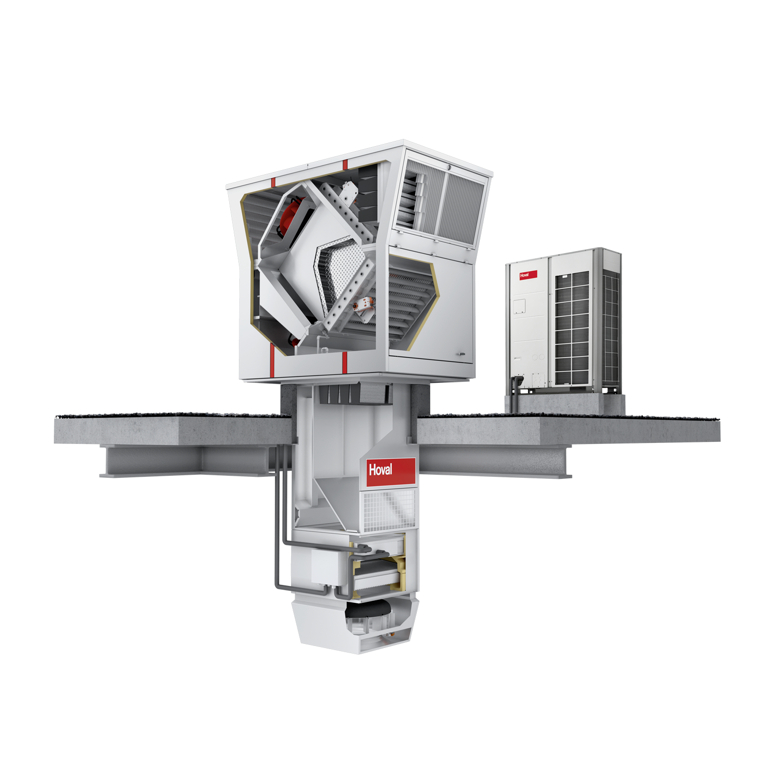 Hoval RoofVent, dat is een reeks van ventilatie-units (luchttoevoer & -afvoer) voor het ventileren en het verwarmen en koelen van hoge ruimtes met verse en recirculatie lucht. Het koelen en verwarmen van de toegevoerde lucht gebeurt met behulp van krachtige, geïntegreerde warmtewisselaars. Tot 86% van de energie kan er teruggewonnen worden uit de afgevoerde lucht. Deze aerothermen worden voornamelijk geplaatst in productiehallen, logistieke gebouwen en werkplaatsen. Ook in sporthallen, zwembaden, vliegtuighangars en winkelcentra komen deze units goed tot hun recht.