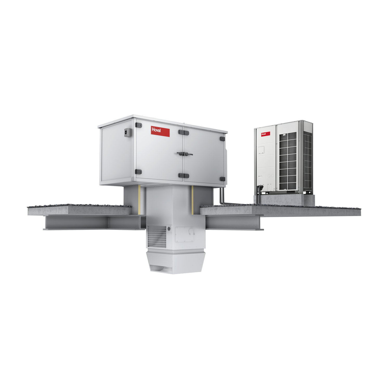 Recirculatie-unit voor het verwarmen en koelen van ruimten. Met dakunit voor een vrije, onderliggende doorgang tijdens een onderhoud.